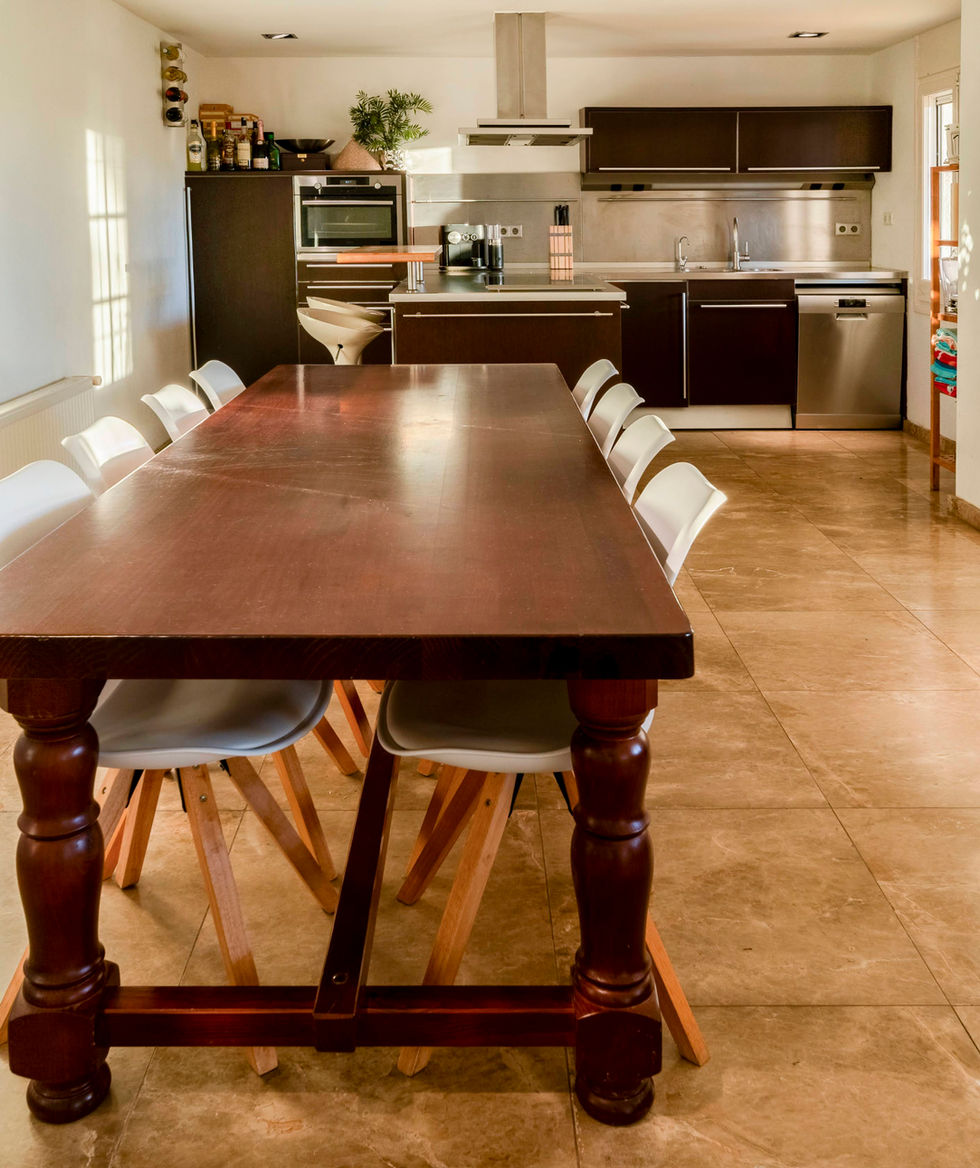 Spacious, glazed dining room overlooking the garden, a separate fully equipped kitchen, a guest toilet, and a large veranda ideal for outdoor dining.
